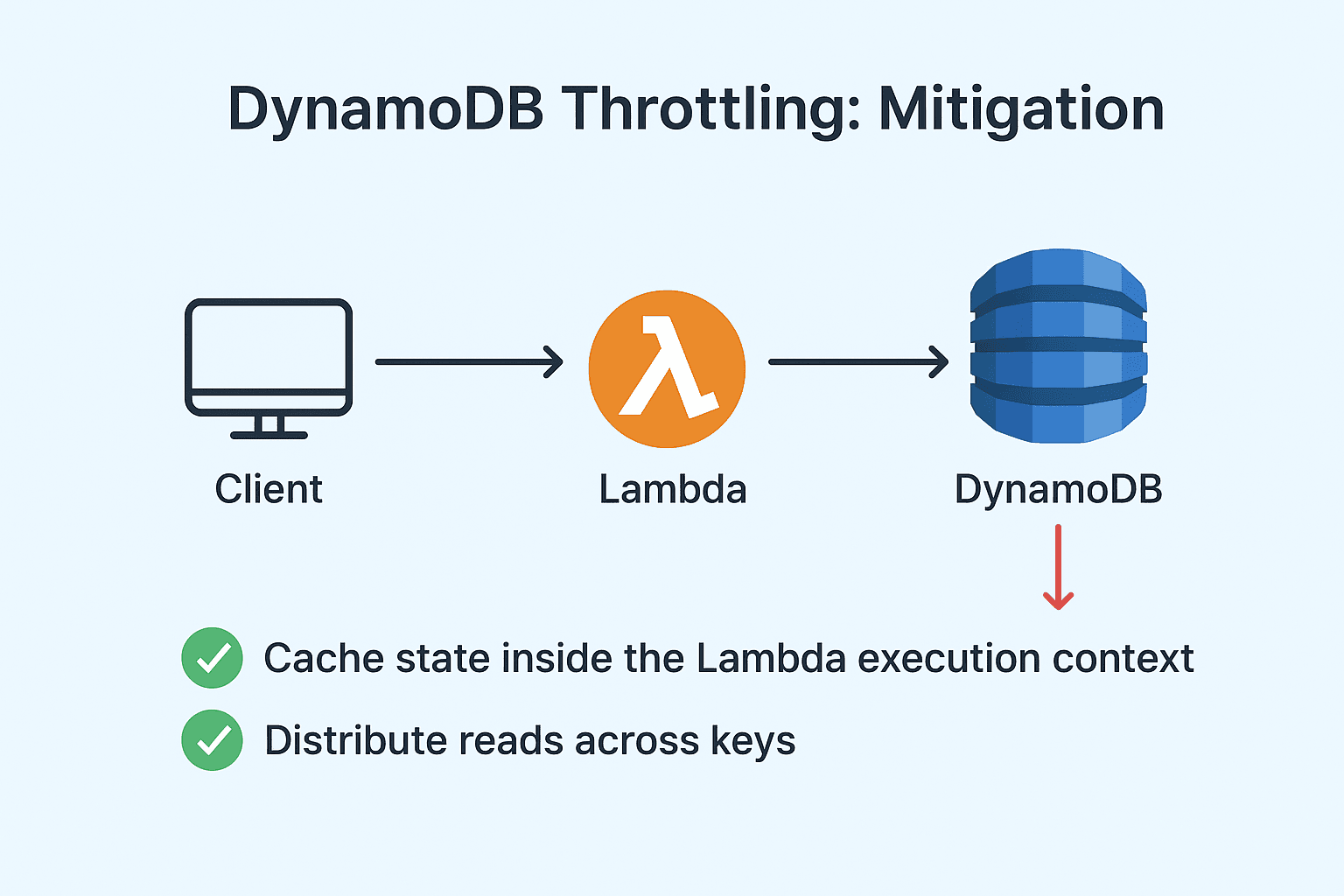 To prevent this issue from reoccurring, we approached the solution in layers. The first step was to introduce state caching directly inside the Lambda execution context. Since the state being fetched rarely changed, keeping it in memory between invocations dramatically reduced the number of DynamoDB reads, cutting thousands of requests per minute and relieving immediate pressure on the database.